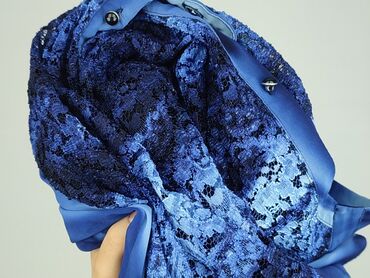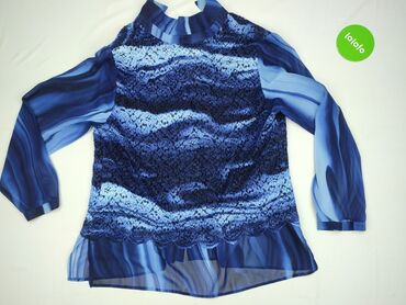 - Materiały i wykończenie: przód z dekoracyjną, elastyczną koronką w odcieniach granatu i błękitu; rękawy i dół z lekkiego, półtransparentnego szyfonu o marmurkowym princie; lamówki i plisa guzikowa z gładkiej tkaniny