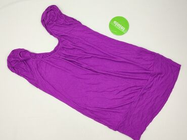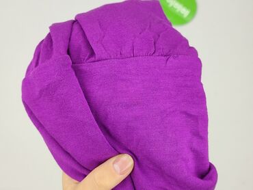 Fioletowa tunika/sweterkowa bluzka damska z krótkim rękawem - Krój: wydłużona tunika do bioder, lekko dopasowana - Dekolt: w kształcie litery V, obszyty jaśniejszym, prążkowanym ściągaczem - Rękaw...Stan: