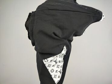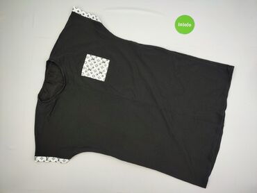 Krótki rękawCzarna, asymetryczna tunika/bluza oversize z krótkim rękawem. Model o luźnym kroju z obniżoną linią ramion. Z przodu naszywana kieszeń z białej tkaniny w czarno‑szary wzór monogramowy; ten sam kontrastowy materiał wykończa brzegi rękawów. Dodatkowy akcent stanowią dekoracyjne aplikacje/nity na trójkątnym wstawieniu po boku. Okrągły dekolt, miękka dzianina bawełniana z domieszką elastanu (na uciągliwość). Długość sięgająca za biodro – do noszenia jako długa koszulka lub tunika. Klasyczna czerń z minimalistycznymi białymi detalami sprawdzi się do legginsów, rurek i spódnic.