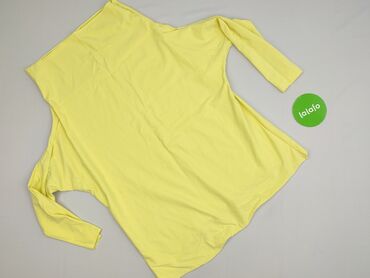 Żółta bluzka damska w poziome pasy - Krój: luźny, z dłuższymi, asymetrycznymi bokami; rękaw 3/4. - Dekolt: okrągły. - Materiał: 95% wiskoza, 5% poliester (wg metki). - Tkanina półprzezroczysta, na...