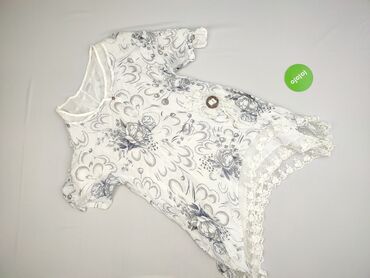 Biała damska tunika/bluzka z krótkim rękawem - Krój: luźny, z obniżoną linią cięcia z przodu, delikatnie wydłużony tył (zaokrąglony dół). - Dekolt: łagodnie łódkowy. - Rękawy: krótkie, lekko opada...