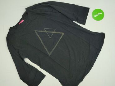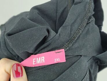 Rękaw 3/4Czarna tunika/bluzka z długim rękawem 3/4, marka EMR, rozmiar 2XL. Luźny, przedłużany krój z okrągłym dekoltem. Z przodu nadruk z geometrycznym motywem odwróconego trójkąta z mniejszym trójkątem w środku, w kolorze przygaszonej szarości. Materiał miękki, elastyczny, bawełniany w dotyku. Tył gładki, bez nadruku. Uniwersalny, minimalistyczny styl – sprawdzi się do legginsów, rurek lub jako oversize’owa koszulka. Kolor: głęboka czerń. Rozmiar z metki: 2XL (EMR).