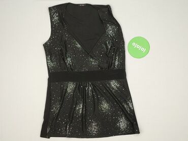 Czarna damska bluzka bez rękawów - Fason: luźny, lekko bombkowy z marszczeniem przy dole (gumka) - Dekolt: okrągły - Przód: pionowe zakładki/marszczenia modelujące sylwetkę - Tył: gładki - Materia...