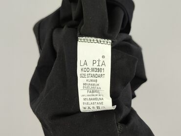 Czarna tunika damska marki La Pia w rozmiarze L/XL. Tunika ma krótki rękaw i okrągły dekolt, ozdobiony białym obszyciem. Z przodu znajduje się srebrny nadruk imitujący logo. Na dole tuniki, z przod...