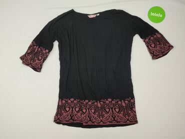 Czarna tunika damska SILJE, rozmiar 38. - Fason: lekko rozkloszowana tunika z marszczeniami pod biustem, długość za biodra - Rękaw: 3/4 - Dekolt: głębszy w kształcie litery V - Ozdoby: efektowny h...
