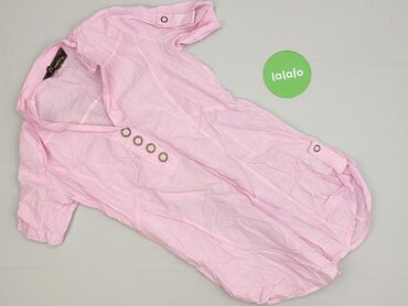 Bladoróżowa damska bluzka tunikowa z długim rękawem. - Rozmiar: S - Krój: lekko wydłużony tył, zaokrąglony dół - Dekolt: w serek z krótką listwą guzikową (4 guziki) - Kieszeń: jedna naszywana na p...