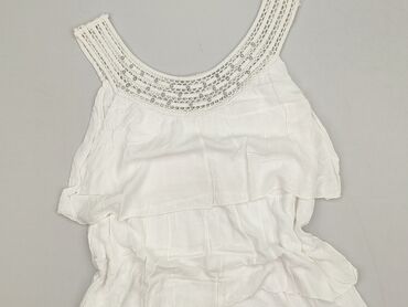 Biała bluzka/tunika damska bez rękawów z ażurową górą. - Kolor: biały - Krój: luźny, tunikowy; tył dłuższy, delikatnie zaokrąglony - Rękawy: krótkie falbanki przy ramionach - Detale: ażurowa, haft...