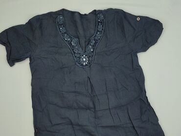 Bluzka damska F&F - Kolor: granatowy - Materiał: 100% wiskoza (etikieta na zdjęciu) - Krój: luźny, tunikowy - Rękaw: 3/4 - Dekolt: okrągły z niewielkim rozcięciem i troczkami do wiązania - Ozdoby:...