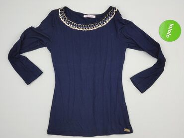 Granatowa tunika/bluzka z długim rękawem - Fason: wydłużona tunika, lekko zaokrąglony dół - Dekolt: V z szeroką listwą i długą szarfą do wiązania (kokarda/węzeł) - Rękawy: długie, zakończone manki...Stan: