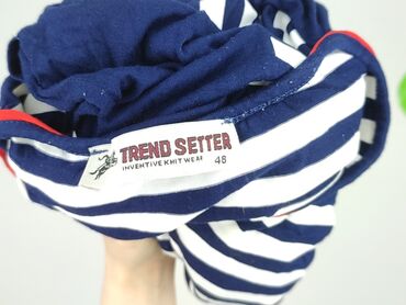- Wzór: biało‑granatowe poziome paski w stylu marynistycznym