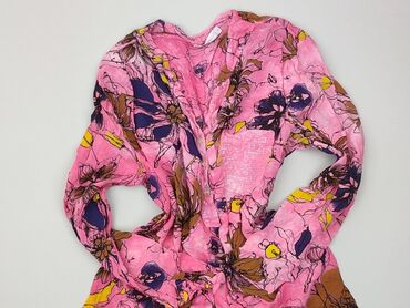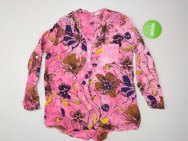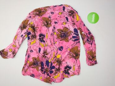 Długi rękawDamska koszula/tunika z długim rękawem w intensywnym, różowym kolorze z artystycznym, kwiatowym nadrukiem (odcienie granatu, brązu, żółci). Luźny, przedłużany krój z zaokrąglonym dołem. Dekolt w serek z krótką listwą guzikową z masy perłowej, ozdobną lamówką z drobnymi cekinami. Na piersi naszyta kieszonka z delikatnym, punktowym wzorem. Rękawy z możliwością podpięcia (patki i guziki). Materiał lekki i przewiewny, idealny na wiosnę i lato.