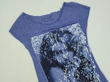 Tunika damska Fresh Made w kolorze chłodnego fioletu (melanż). Luźny, asymetryczny krój z wydłużonym bokiem, krótki rękaw typu kimono i łagodny dekolt. Z przodu duży panel z połyskującymi, srebrnymi cekinami układającymi się w graficzny portret, tworzący efektowny, wieczorowy akcent. Tył gładki.