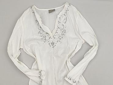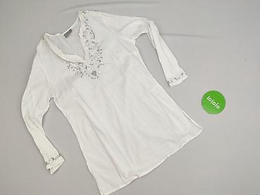 Biała tunika/bluzka damska z długim rękawem. - Materiał: lekka tkanina o wyglądzie lnu/bawełny - Krój: wydłużony, lekko rozkloszowany dół, zaokrąglony brzeg - Zapięcie: rząd małych guzików z przod...