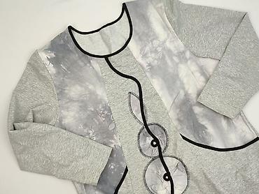 - Przód: dekoracyjne panele w odcieniach szarości z efektem watercolor/tie‑dye oraz kontrastowa czarna lamówka tworząca ozdobną linię; dwie wszyte kieszenie z lamówką; aplikacje/rozetki z tkaniny na środku.