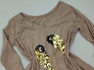 Rękaw 3/4Beżowa tunika/bluzka damska z dłuższym krojem i rękawem 3/4. Dekolt w kształcie litery V. Przód zdobi duża aplikacja z cekinów w kolorze złotym i czarnym z dekoracyjnym, złotym łańcuszkiem.
