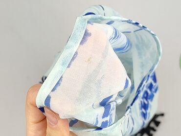 - Wzór: poziome, malarskie pasy w odcieniach błękitu i granatu na jasnym tle