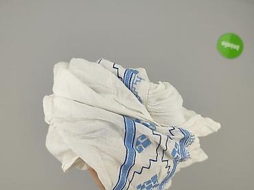 Biała bluzka damska typu hiszpanka, krótka (crop top) z szerokimi, bufowanymi rękawami 3/4. Dekolt łódkowy/opuszczany na ramiona z wszytą gumką i troczkiem do regulacji z przodu. Na rękawach niebieskie, etniczne hafty/wzory w pasach. Tkanina lekka, pofalowana, przewiewna, przyjemna w dotyku. Krój luźny, swobodnie układający się. Idealna do stylizacji boho i letnich zestawów z jeansami lub spódnicą.