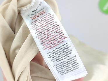 - Instrukcje pielęgnacji widoczne na metce; informacja “Keep away from fire”