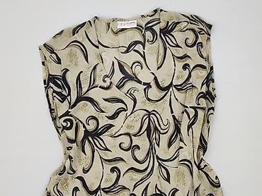 Damska bluzka bez rękawów z dekoltem w serek i marszczeniem na środku. Wzór: kwiatowy/abstrakcyjny w odcieniach czerni, bieli, szarości i żółci. Miękki, elastyczny materiał dobrze dopasowujący się ...