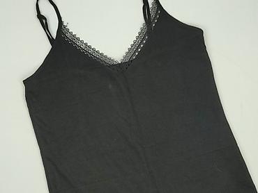 Czarny top damski bez rękawów, rozmiar M - Fason: prosty, na grubszych ramiączkach, okrągły dekolt - Materiał: 80% poliamid, 20% wiskoza – lekko elastyczna, cienka tkanina z delikatną, pionową fak...