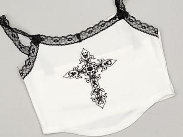 Biały top damski na ramiączkach z czarną koronką i nadrukiem krzyża na przodzie.