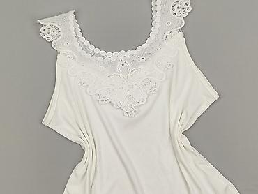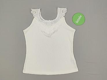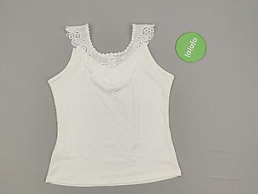 Biała damska koszulka bez rękawów (top) z ażurowym wzorem. - Rozmiar: L - Krój: bez rękawów, dekolt w serek z krótką listwą i trzema ozdobnymi guzikami; delikatnie zaokrąglony dół - Materiał: 95% ...