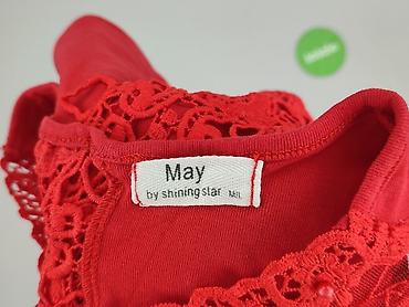 Czerwony top damski marki May by shining star, wykonany z mieszanki 95% bawełny i 5% elastanu, co zapewnia komfort noszenia i elastyczność. Charakteryzuje się okrągłym dekoltem ozdobionym koronką z drobnymi koralikami. Koronkowy wzór kontynuowany jest na plecach, dodając elegancji. Idealny do codziennych stylizacji lub na specjalne okazje.