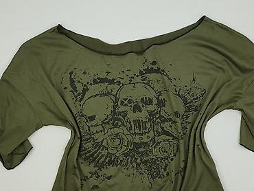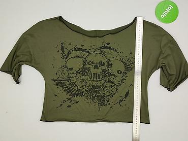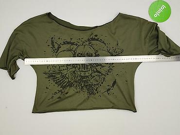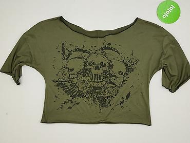 Damska bluzka crop top w kolorze khaki z dużym, czarnym nadrukiem w rockowym stylu (trzy czaszki, róże, skrzydła, efekt rozprysków). Luźny fason z szerokim dekoltem typu łódka i opadającymi rękawami do łokcia. Materiał miękki, elastyczny i lekki.
