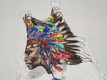 - Nadruk: duży, kolorowy motyw graficzny z piórami w intensywnych barwach (czerwienie, błękity, żółcie, zielenie)