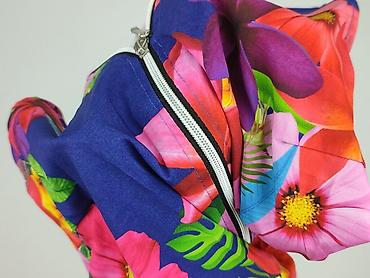 - Wzór: intensywny, tropikalny print w kwiaty i liście na granatowym tle (fuksja, pomarańcz, żółć, zieleń, turkus, fiolet)
