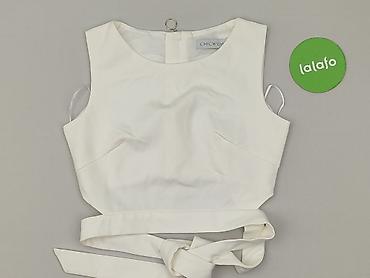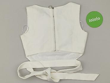Top damski bez rękawów, rozmiar S. - Kolor: ecru/łamana biel - Krój: kopertowy dekolt V z odcięciem pod biustem, lekko dopasowany - Detale: delikatne falbanki z tiulu przy dekolcie i pachach - Mate...