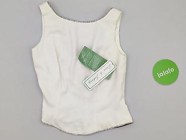 Top damski bez rękawów, rozmiar S. - Kolor: ecru/łamana biel - Krój: kopertowy dekolt V z odcięciem pod biustem, lekko dopasowany - Detale: delikatne falbanki z tiulu przy dekolcie i pachach - Mate...