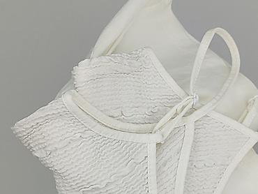 Biały damski top bez rękawów z kopertowym dekoltem V i delikatną baskinką u dołu. Z tyłu wszyty pasek do przewiązania, po bokach zaszewki modelujące sylwetkę. Lekko elastyczna tkanina, gładka, niep...Rozmiar: