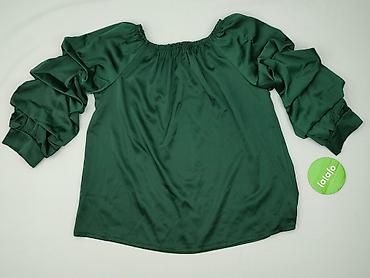 Bluzka damska w kolorze butelkowej zieleni, wyprodukowana we Włoszech. Model z elastycznym, marszczonym dekoltem typu łódka/karczek oraz efektownymi, kaskadowo marszczonymi rękawami zakończonymi szerokimi mankietami. Tkanina z subtelnym, lekko satynowym połyskiem – miękka, płynnie układająca się.