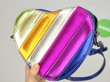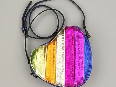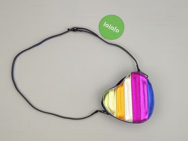 TorebkaTorebka na ramię w kształcie serca, połyskująca, w paski tęczowe z przodu (zielony, złoty, srebrny, różowy, niebieski), tył jednolity metaliczny niebieski. Wykonana z imitacji skóry o fakturowanej powierzchni, z połyskiem holograficznym. Zamykanie na suwak u góry.