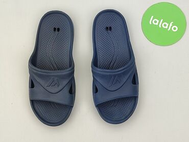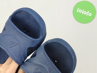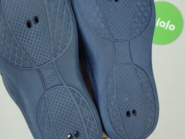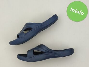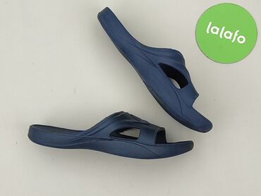 Damskie klapki w kolorze niebieskim - Model wsuwany, z zabudowaną górą z wycięciem pośrodku - Materiał wierzchni: miękka, gładka skóra ekologiczna (na połysk) - Wnętrze z jasną, przyjemną w dotyku...