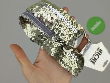 Biały pasek materiałowy z cekinami i klamrą typu podwójne D-ring. - Kolor: biały z złotymi/srebrnymi cekinami (sekcje ozdobne na długości paska) - Zapięcie: dwie metalowe obręcze D (srebrny kolor)...Srebrny, elastyczny pasek z cekinami