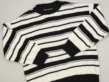Sweterek damski Reserved, rozmiar S. - Krój luźny, z opuszczoną linią ramion i 3/4 rękawem. - Dzianina w poziome pasy: białe, czarne i szare, z dekoracyjnym, ząbkowanym wzorem. - Okrągły dekolt....