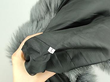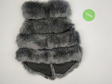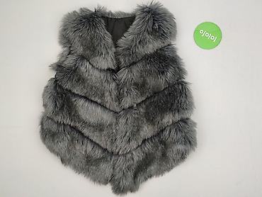 Damska kamizelka futrzana, kolor: chłodny szary/srebrzysty. Model bezrękawnik, pikowany poziomymi pasami z efektownym ułożeniem „V” z przodu. Gęste, miękkie i puszyste futro (syntetyczne – brak metki składu; wizualnie imitacja lisa), od spodu gładka podszewka w kolorze czarnym. Zapięcie ukryte z przodu (haczyki). Krój lekko wydłużony z tyłu, zaokrąglone wykończenie dołu.