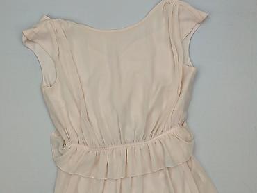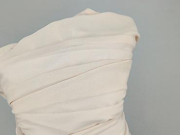 - Fason: kobiecy, lekko rozkloszowany dół, odcięcie w talii z marszczeniami i delikatną falbaną; górą bez rękawów z miękkimi zakładkami