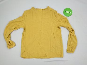 Bluzka damska z długim rękawem, w kwiatowy print na żółtym tle. - Krój: lekko taliowana, z marszczeniami przy mankietach; okrągły dekolt z małym rozcięciem i zapięciem na guzik z tyłu. - Wzór/kolo...