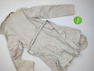- Fason: taliowany, zapinany na guziki, z kołnierzem i paskiem do przewiązania w talii