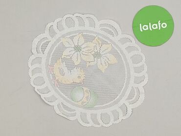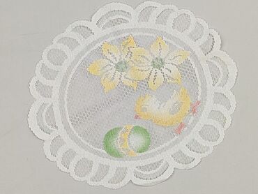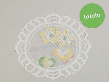 Ażurowa serwetka okrągła z motywem wielkanocnym - Wzór: żółty kurczaczek, pisanka i kwiaty, delikatny nadruk w pastelowych kolorach (żółty, zielony, biały) - Kształt: okrągła, dekoracyjny brzeg w ...
