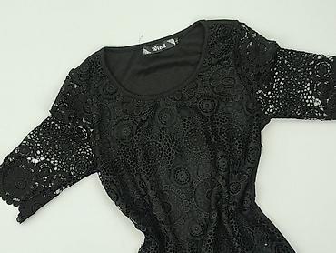 Sukienka damska, czarna, z koronkowymi rękawami - Fason: lekko rozkloszowany, długość mini/tuż nad kolano - Dekolt: w kształcie litery V - Rękawy: długie, z czarnej, ażurowej koronki - Tył: ozdobn...
