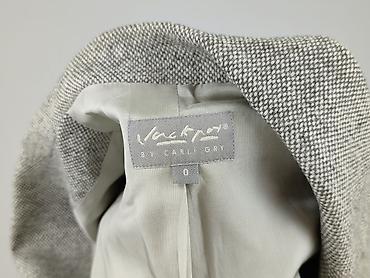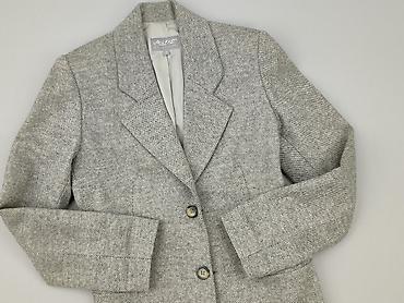 Szary damski żakiet/marynarka - Krój: taliowany, podkreślający sylwetkę, długość do bioder - Zapięcie: na 4 guziki z przodu - Kołnierz: szerokie, wywijane klapy - Rękawy: długie - Kieszenie: dwie ...Rozmiar: