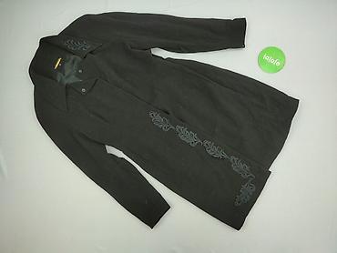 Płaszcz damski LOV.LI, rozmiar 40 - Krój: prosty, bez zapięcia, okrągły dekolt - Długość: midi - Kolor: czarny z kontrastowymi, zielonymi wstawkami z miękkiego pluszu na mankietach i przy kieszeni...