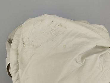 Męski płaszcz/trencz w kolorze jasnego beżu. Model dwurzędowy z szerokimi klapami, naramiennikami i paskiem w talii. Zapięcie na guziki, mankiety z regulacją na guziki. Wnętrze z pikowaną, ocieplaną podszewką zapewniającą komfort w chłodniejsze dni. Z tyłu karczek przeciwdeszczowy. Rozmiar z metki: 52. Materiał zewnętrzny gładki, lekko połyskujący. Na dole z tyłu widoczne miejscowe zabrudzenia (pokazane na zdjęciu). Klasyczny, elegancki fason idealny do stroju formalnego i smart casual. Dla dorosłego mężczyzny.