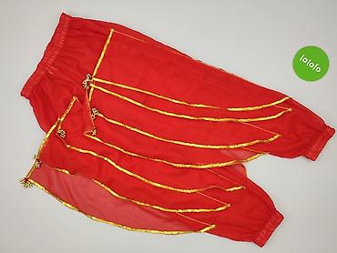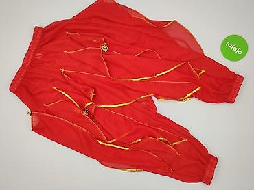 - Spodnie haremki: zwiewny, półprzezroczysty materiał; elastyczna gumka w pasie i przy nogawkach; naszyte pasma z lamówką w kolorze złota oraz drobnymi dzwoneczkami podkreślającymi ruch.