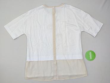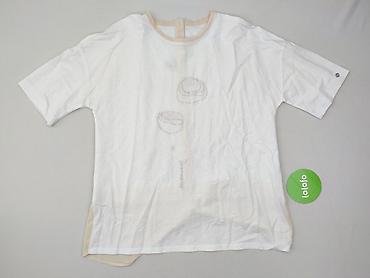 Damska bluzka/t-shirt z krótkim rękawem w kolorze białym z beżowymi akcentami. Luźny, prosty krój z obniżoną linią ramion i półokrągłym dekoltem obszytym beżową lamówką. Z przodu subtelny, haftowany motyw roślinny/kwietny w odcieniach beżu. Plecy z dekoracyjną beżową listwą pośrodku i przedłużonym, półtransparentnym panelem w kolorze ecru/beż (efekt warstwowy, dłuższy tył). Rękaw do łokcia z małą metalową aplikacją przy krawędzi. Miękka, przewiewna tkanina; panel dolny na plecach z lekkiego, zwiewnego materiału. Idealna do codziennych stylizacji i smart casual. Dla kobiety, rozmiar luźny/oversize (dokładne wymiary do dopasowania na życzenie). Condition: Ideal. Newness condition: Used.