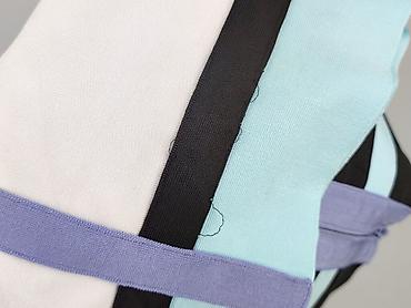 - Kolorystyka: biel, jasny turkus, lawendowy fiolet, czarne pasy – geometryczny, optycznie wysmuklający wzór